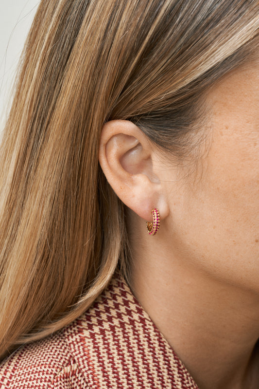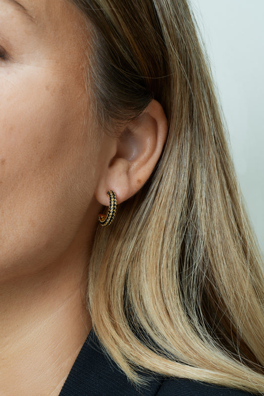Kollektionen finns i 18k guldpläterad eller 925 sterling silverpläterad mässing, med kubiska zirkoner i färger som sträcker sig från klassiskt vitt till djärvt rött, djupt grönt och varmt brunt. Välj mellan Olli Mini, 9 mm eller Olli Large, 11 mm. Eller varför inte kombinera dem bredvid varandra?